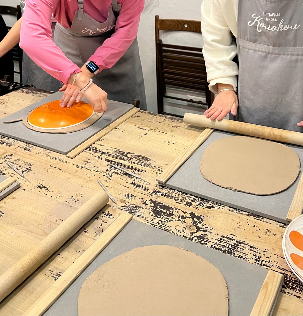 Работаем в основном за гончарным кругом, делаем две формы на выбор: кружки/миски/пиалы/горшочка. За столом - прикрепляем ручку и украшаем наши изделия. Штампы, фигурные скалки, кружева, петли и стеки - весь набор гончарных инструментов в вашем распоряжении.